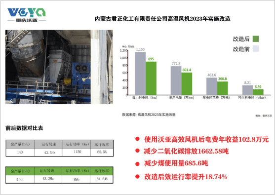 內(nèi)蒙古君正化工有限責(zé)任公司水泥分公司的高效節(jié)能高溫風(fēng)機(jī)技改項(xiàng)目通過沃亞高效風(fēng)機(jī)的應(yīng)用,不僅取得了顯著的經(jīng)濟(jì)效益,還為環(huán)境保護(hù)和資源節(jié)約做出了積極貢獻(xiàn)。這一項(xiàng)目的成功案例表明,投資于技術(shù)改進(jìn)和節(jié)能措施不僅有助于企業(yè)提高競(jìng)爭(zhēng)力,還有助于社會(huì)的可持續(xù)發(fā)展。以下是詳細(xì)數(shù)據(jù)說明: