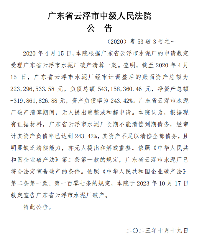 日前,廣東云浮市中級人民法院(以下簡稱“云浮市中院”)發(fā)布公告稱,截至2020年4月15日,廣東省云浮市水泥廠賬面資產(chǎn)總額2.23億元,負債總額5.43億元,凈資產(chǎn)總額-3.19億元,資產(chǎn)負債率為243.42%。因企業(yè)長期不能清償?shù)狡趥鶆?wù),資產(chǎn)不足以清償全部債務(wù),且明顯缺乏清償能力,亦無人提出和解或重整,宣告破產(chǎn)。
