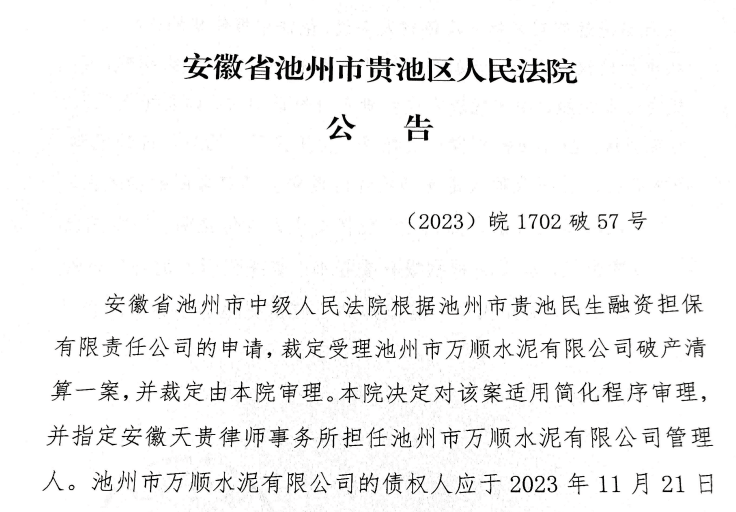 10月19日,安徽省池州市貴池區(qū)人民法院公告稱,安徽省池州市中級人民法院根據(jù)池州市貴池民生融資擔保有限責任公司的申請,裁定受理池州市萬順水泥有限公司破產(chǎn)清算一案。