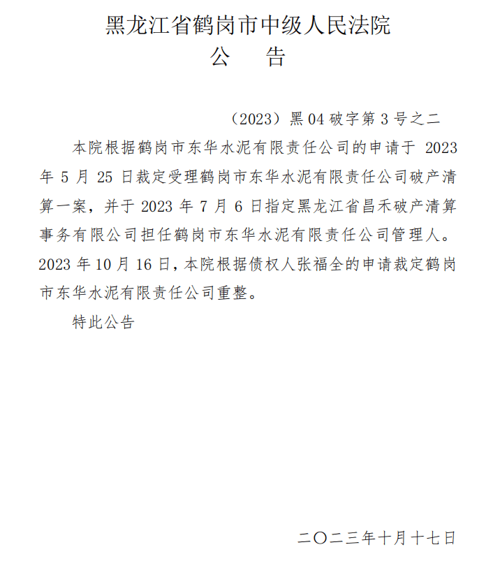 鶴崗市東華水泥有限責任公司被申請破產(chǎn)重整