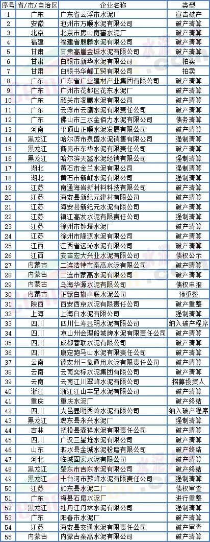 55家水泥企業(yè)宣告破產(chǎn)