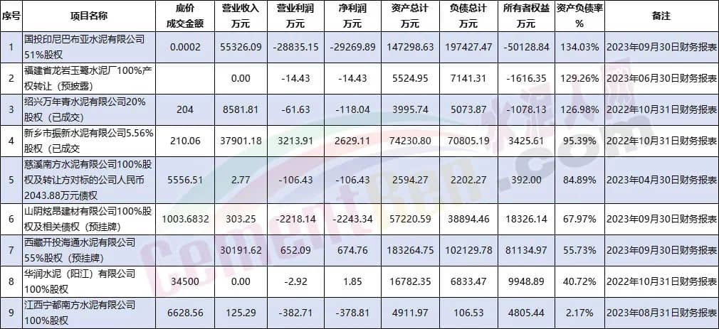 除已宣告破產(chǎn)的企業(yè)外,另有部分企業(yè)公開出讓股權(quán)。其披露信息顯示,資產(chǎn)負債率達100%以上。其中,國投印尼巴布亞水泥有限公司2023年09月30日財務(wù)報表顯示,資產(chǎn)負債率達134.03%。海螺水泥持股比例達49%,為其第二大股東。企業(yè)負債總計達19.74億,所有者權(quán)益為-5.01億,51%股權(quán)以2元底價出售。