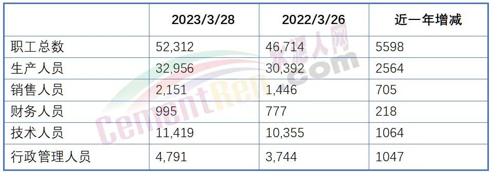從海螺上市公司數(shù)據(jù)可見,海螺水泥員工人數(shù)已達52312人,較2022年新增5598人,前三季度人均創(chuàng)利16.58萬元。近一年來,海螺水泥生產(chǎn)人員增加達2564人,技術(shù)及行政管理人員增加超千人。