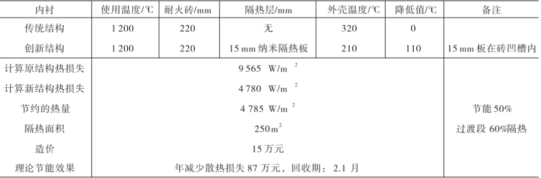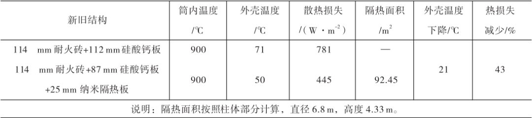 采用納米隔熱板替換原硅酸鈣板一段時間后發(fā)現(xiàn),C5旋風(fēng)筒散熱損失減少336W/m2,外殼溫度下降21℃,熱損失減少43%,加強耐火襯的隔熱效果。