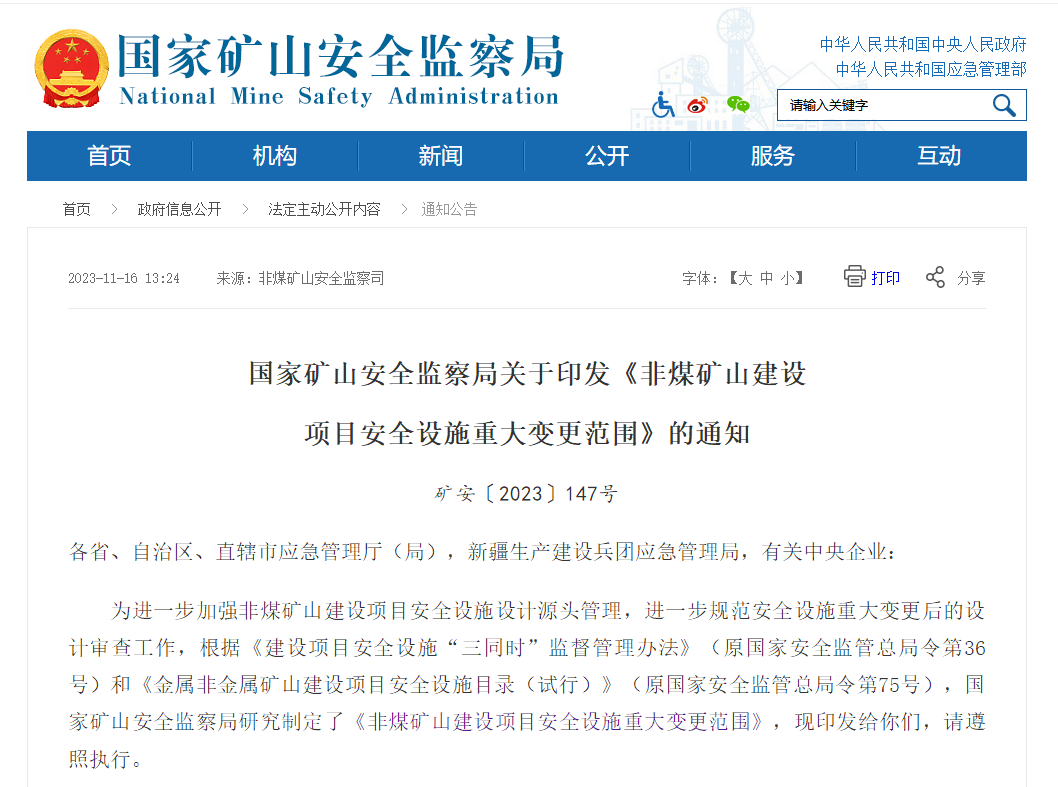 日前,國家礦山安全監(jiān)察局關(guān)于印發(fā)《非煤礦山建設(shè)項(xiàng)目安全設(shè)施重大變更范圍》的通知給各省、自治區(qū)、直轄市應(yīng)急管理廳(局),新疆生產(chǎn)建設(shè)兵團(tuán)應(yīng)急管理局,有關(guān)中央企業(yè)。