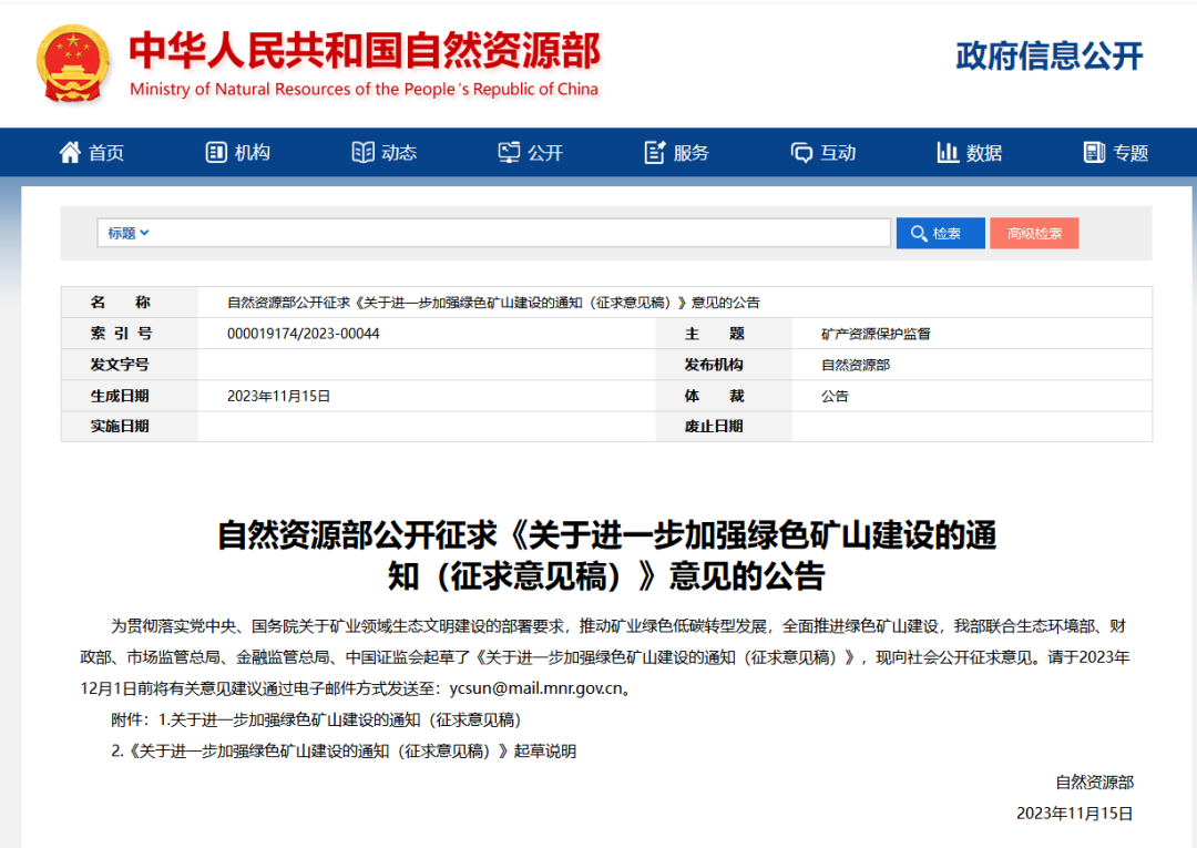 同期,自然資源部發(fā)布自然資源部公開征求《關(guān)于進(jìn)一步加強(qiáng)綠色礦山建設(shè)的通知(征求意見稿)》意見的公告。