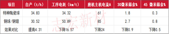 貴州紅獅水泥某企業(yè)4.6×14.5米磨機二倉原用普通第一代陶瓷球,改用第三代特種陶瓷球后,臺產(chǎn)提高30.3t/h,增產(chǎn)幅度10%;粉磨工序電耗降低1.5度/噸,下降幅度6.5%;入庫水泥45μm篩余細度降低1.0,比表面積提高9.6。