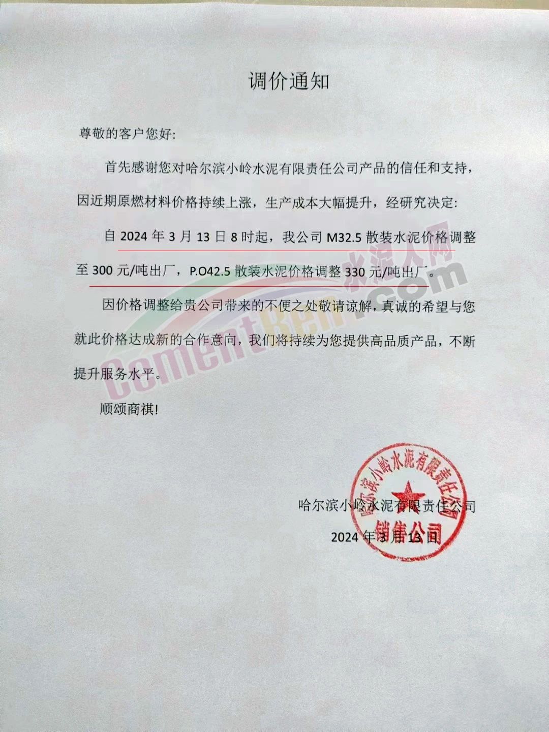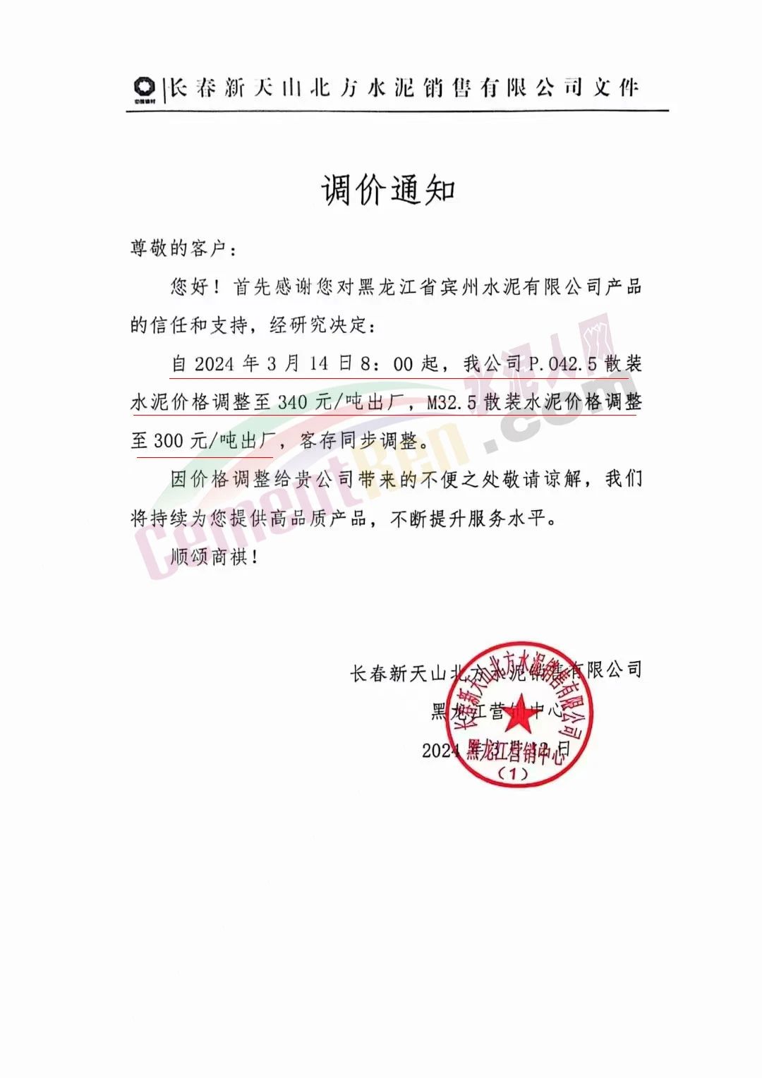 水泥人網(wǎng)通訊員消息:日前,長春新天山北方水泥銷售有限公司黑龍江營銷中心通知,自2024年3月14日8時(shí)起,公司P.O42.5散裝水泥價(jià)格調(diào)整至340元/噸出廠,M32.5散裝水泥價(jià)格調(diào)整至300元/噸出廠,客存同步調(diào)整。