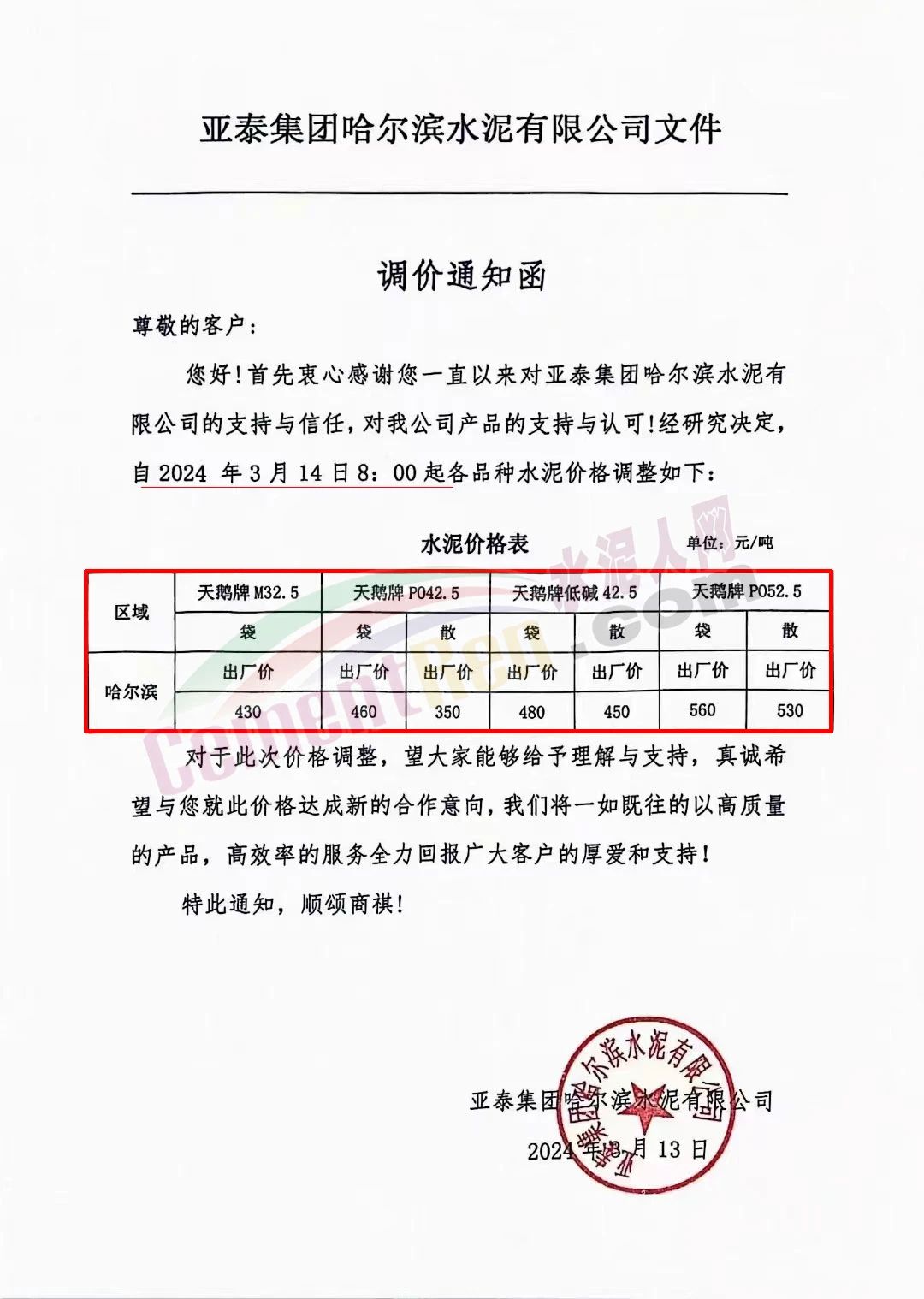 亞泰集團(tuán)哈爾濱水泥有限公司通知,自2024年3月14日8時(shí)起調(diào)整各品種水泥價(jià)格,調(diào)整后天鵝P.O42.5散裝水泥出廠價(jià)350元/噸。