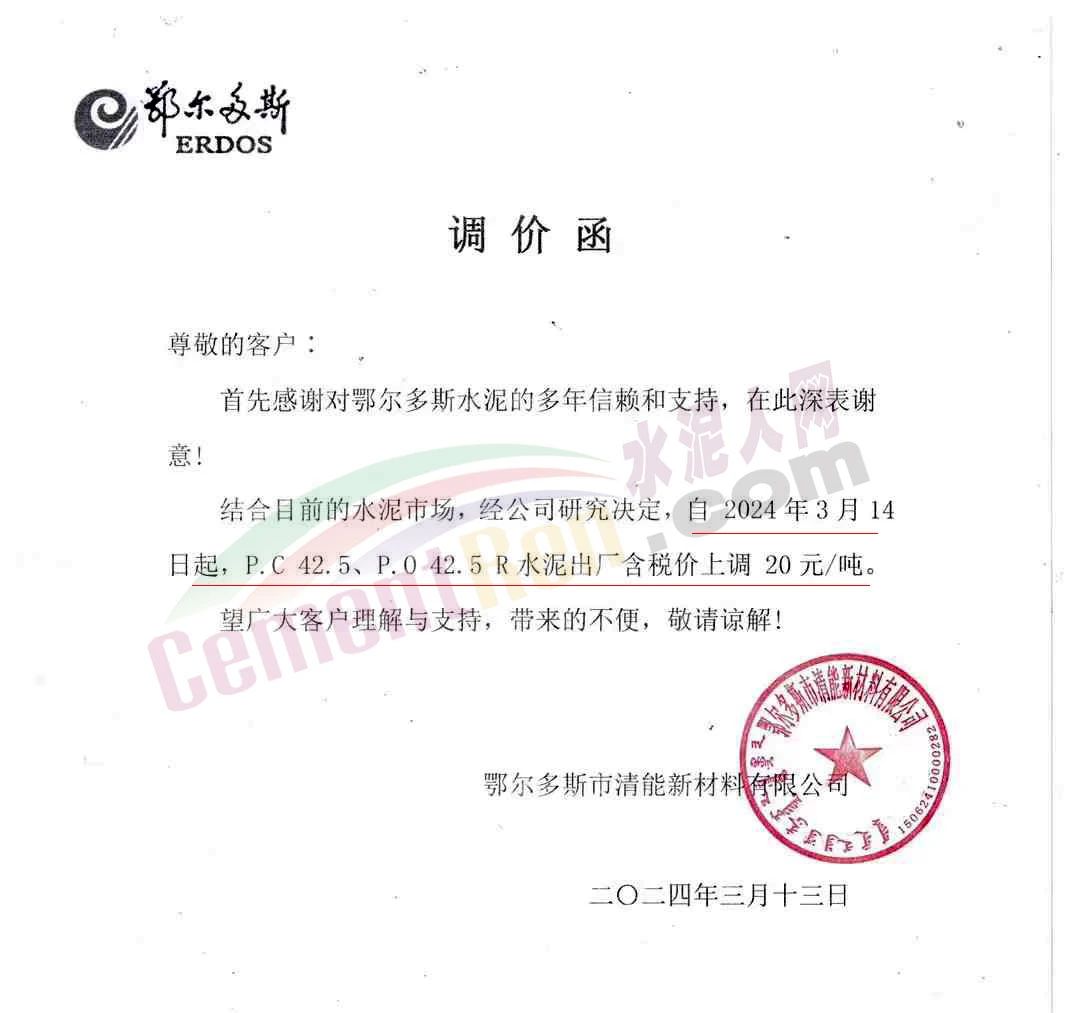 鄂爾多斯市清能新材料有限公司通知,結(jié)合目前的水泥市場(chǎng),經(jīng)公司研究決定,自2024年3月14日起,P.C42.5、P.O42.5R水泥出廠含稅價(jià)上調(diào)20元/噸。