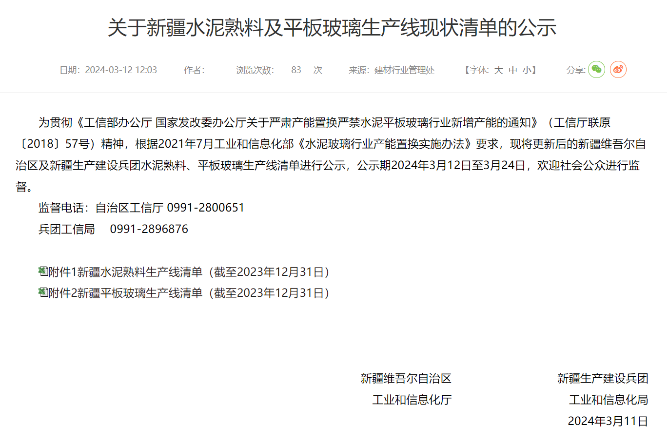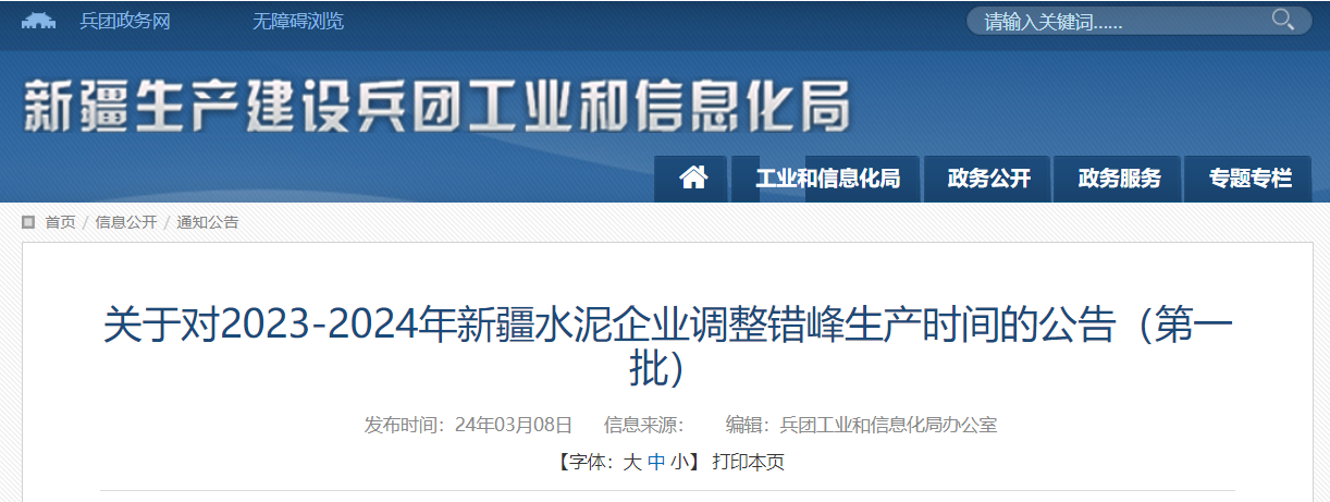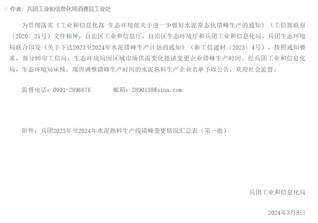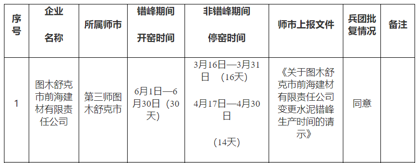 同期,新疆生產(chǎn)建設(shè)兵團(tuán)工業(yè)和信息化局2023-2024年新疆水泥企業(yè)調(diào)整錯(cuò)峰生產(chǎn)時(shí)間的公告(第一批)。圖木舒克市前海建材有限責(zé)任公司錯(cuò)峰期間開窯時(shí)間為6月1日—6月30日(30天);非錯(cuò)峰期間,停窯時(shí)間3月16日—3月31日 (16天)4月17日—4月30日(14天)。