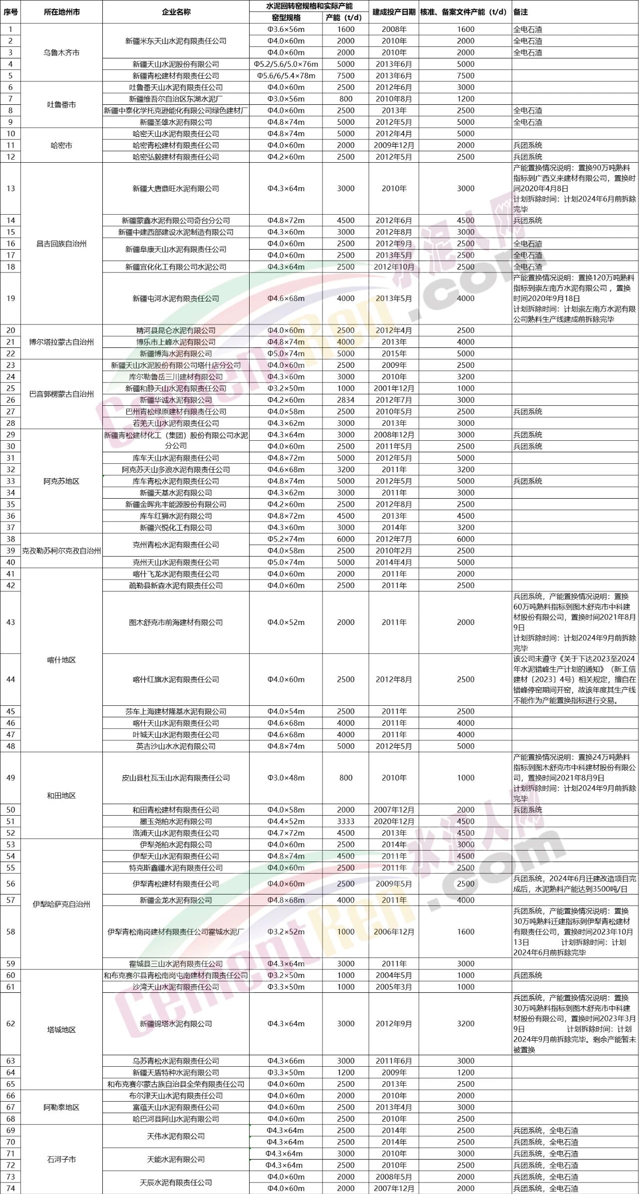 日前,新疆工信廳發(fā)布截至2023年12月底的水泥熟料生產(chǎn)線清單,74條熟料生產(chǎn)線合計(jì)產(chǎn)能6608.01萬噸/年。其中,全電石渣生產(chǎn)線共14條熟料生產(chǎn)線。