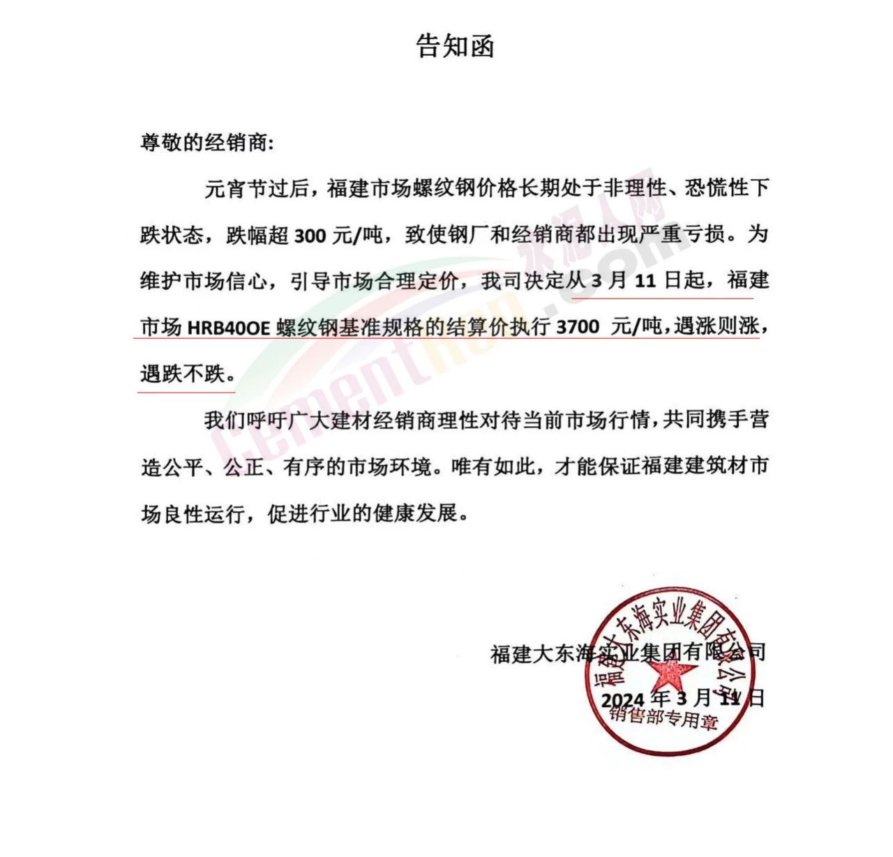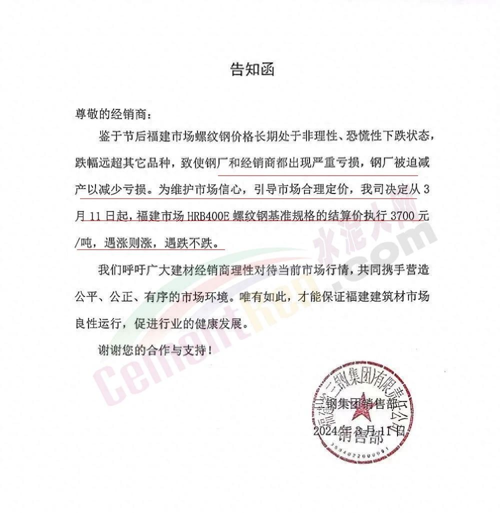 福建區(qū)域鋼鐵企業(yè)通知,鑒于節(jié)后福建市場(chǎng)螺紋鋼價(jià)格長(zhǎng)期處于非理性、恐慌性下跌狀態(tài),跌幅遠(yuǎn)超其它品種,致使鋼廠和經(jīng)銷商都出現(xiàn)嚴(yán)重虧損,鋼廠被迫減產(chǎn)以減少虧損。為維護(hù)市場(chǎng)信心,引導(dǎo)市場(chǎng)合理定價(jià)。福建鋼廠集體限價(jià),遇漲則漲,遇跌不跌。
