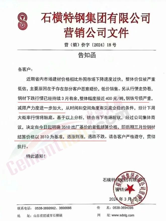 山東鋼廠通知,從行情走勢(shì)看,鋼材下跌行情已經(jīng)持續(xù)3月有余,整體幅度接近400元/噸,鋼鐵虧損嚴(yán)重,減限產(chǎn)力度進(jìn)一步加大。從時(shí)間和空間角度有見(jiàn)底企穩(wěn)的條件,預(yù)計(jì)下周大概率行情將觸底。經(jīng)公司商議決定即日起明確3519出廠價(jià)基價(jià)的最低結(jié)算價(jià)格,即后期三月份鋼材結(jié)算價(jià)格以3519為基準(zhǔn),遇漲則漲,遇跌不跌。