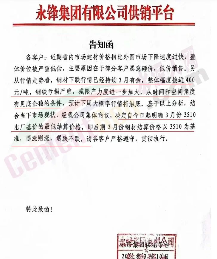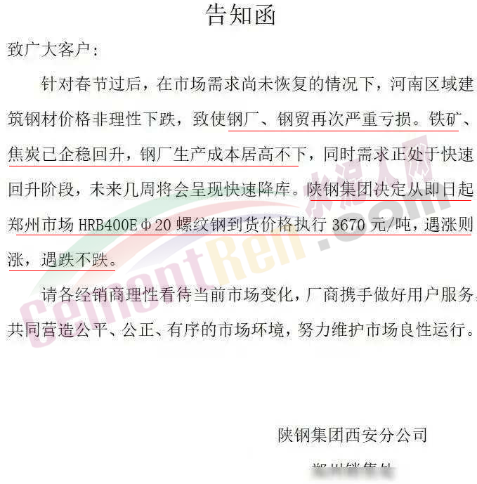 水泥人網(wǎng)通訊員消息:春節(jié)長(zhǎng)假剛剛結(jié)束,建筑鋼材的價(jià)格就開(kāi)始狂跌。有些鋼廠看不下去了,開(kāi)始發(fā)限價(jià)通知價(jià)格跟漲不跟跌。