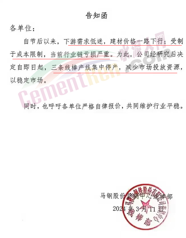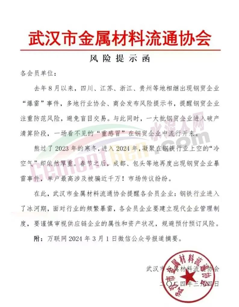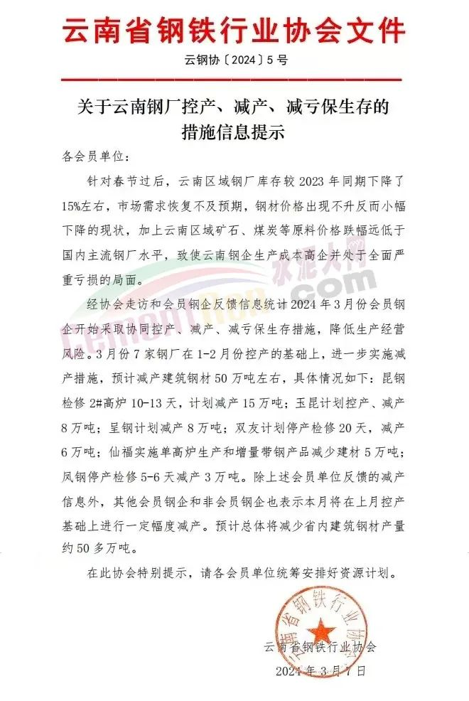 武漢市金屬材料流通協(xié)會(huì)發(fā)布《風(fēng)險(xiǎn)提示函》提到,鋼鐵行業(yè)進(jìn)入了冰河期;云南省鋼鐵協(xié)會(huì)發(fā)布《關(guān)于云南鋼廠控產(chǎn)、減產(chǎn)、減虧保生存的措施信息提示》稱,2024年3月份鋼企開(kāi)始采取協(xié)同控產(chǎn)、減產(chǎn)、減虧保生存措施,降低生產(chǎn)經(jīng)營(yíng)風(fēng)險(xiǎn)。3月份7家鋼廠在1-2月份控產(chǎn)的基礎(chǔ)上,進(jìn)一步實(shí)施減產(chǎn)措施,預(yù)計(jì)減產(chǎn)建筑鋼材50萬(wàn)噸左右;南京鋼鐵貿(mào)易商會(huì)發(fā)《風(fēng)險(xiǎn)提示函》,提示會(huì)員企業(yè)要及時(shí)調(diào)整經(jīng)營(yíng)策略。