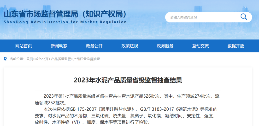 日前,山東省市場監(jiān)管局公布《2023年水泥產(chǎn)品質(zhì)量省級監(jiān)督抽查結(jié)果》稱,2023年第1批產(chǎn)品質(zhì)量省級監(jiān)督抽查共抽查水泥產(chǎn)品526批次,其中,生產(chǎn)領(lǐng)域274批次,流通領(lǐng)域252批次。