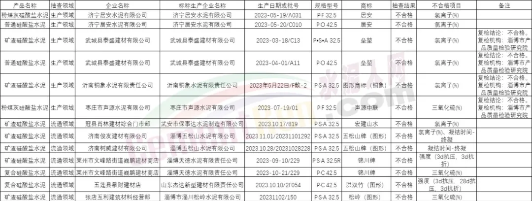 本次抽查發(fā)現(xiàn)濟(jì)寧居安水泥有限公司、武城縣泰盛建材有限公司、沂南銅象水泥有限責(zé)任公司、棗莊市聲源水泥有限公司等6家生產(chǎn)者生產(chǎn)的8批次產(chǎn)品,以及冠縣肖林建材綜合門市部、濟(jì)南俊友建材有限公司、濟(jì)南樹威建材有限公司、萊州市文峰路街道巍鵬建材商店、五蓮縣泉財建材店、張店互利建筑材料經(jīng)營部等6家銷售者銷售的7批次產(chǎn)品不符合相關(guān)標(biāo)準(zhǔn)的要求,不合格項(xiàng)目為三氧化硫、氯離子、水溶性鉻(Ⅵ)、凝結(jié)時間和強(qiáng)度。其中,武城縣泰盛建材有限公司、沂南銅象水泥有限責(zé)任公司、棗莊市聲源水泥有限公司對檢驗(yàn)結(jié)果提出異議,并申請復(fù)檢;經(jīng)復(fù)檢后,維持初檢結(jié)論。