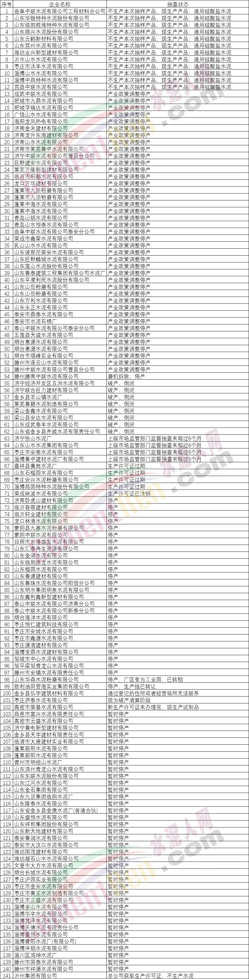 成武中聯(lián)水泥有限公司、肥城市九鼎水泥有限公司、肥城孚瑞達(dá)水泥有限公司、廣饒山水水泥有限公司、海陽龍鳳熱電有限公司、濟(jì)南金禾建材有限公司等41家水泥企業(yè),產(chǎn)業(yè)政策調(diào)整停產(chǎn)。