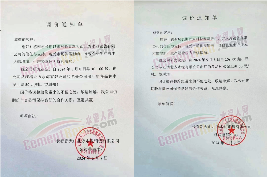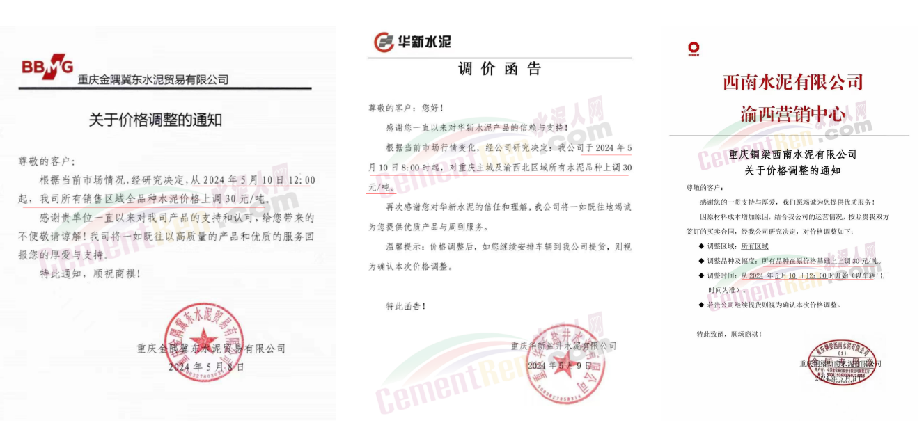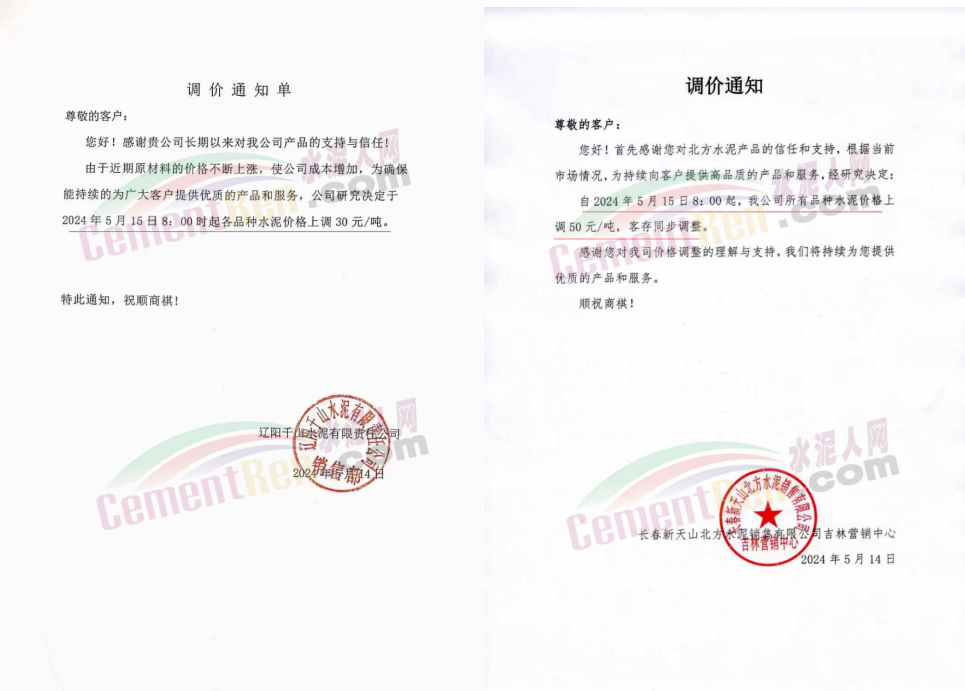 同期遼寧、吉林、黑龍江、河北、河南、重慶等多地水泥企業(yè)通知上調(diào)水泥價格30-50元/噸。