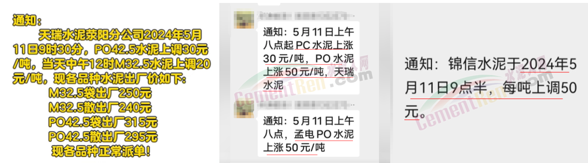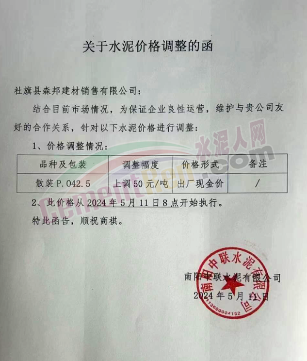 河南天瑞滎陽分公司通知,自5月11日9時30分起,P.O42.5水泥上調(diào)30元/噸,當天中午M32.5水泥上調(diào)20元/噸。價格調(diào)整后M32.5包裝水泥出廠價250元/噸,P.O42.5散裝水泥出廠價295元/噸。南陽中聯(lián)水泥通知5月11日起水泥價格上調(diào)50元/噸。