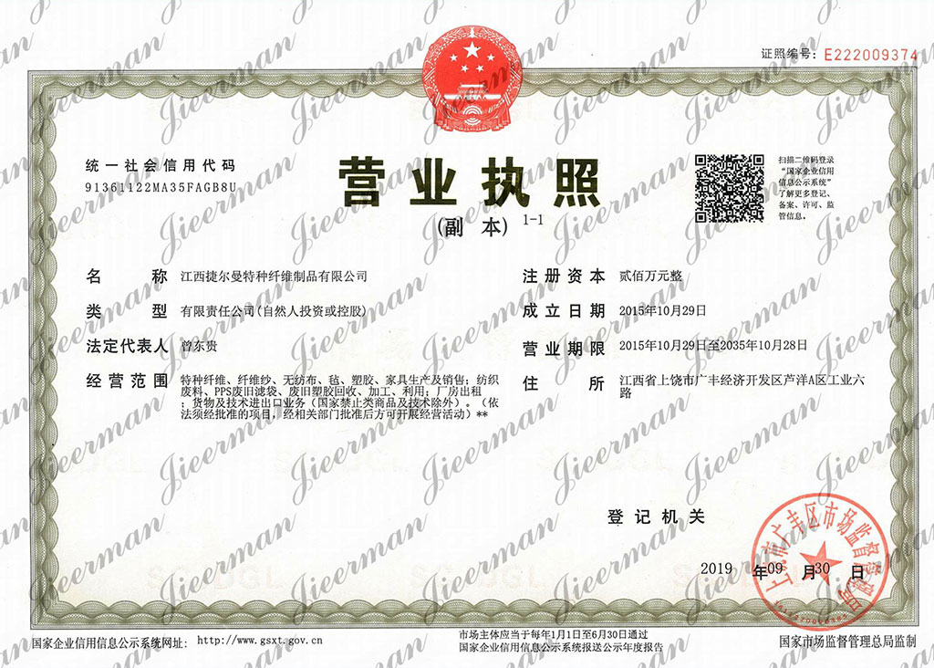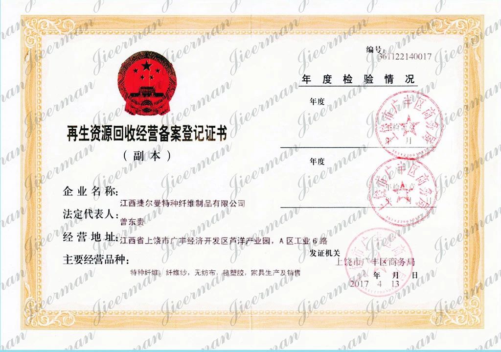 郵寄地址:江西省上饒市廣豐區(qū)廣豐經(jīng)濟(jì)開(kāi)發(fā)區(qū)蘆洋A區(qū)工業(yè)六路 江西捷爾曼特種纖維制品有限公司