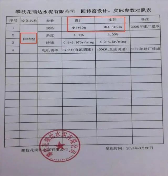 瑞達水泥回轉(zhuǎn)窯設(shè)計參數(shù)和實際參數(shù)。圖據(jù)四川省生態(tài)環(huán)境宣傳教育中心