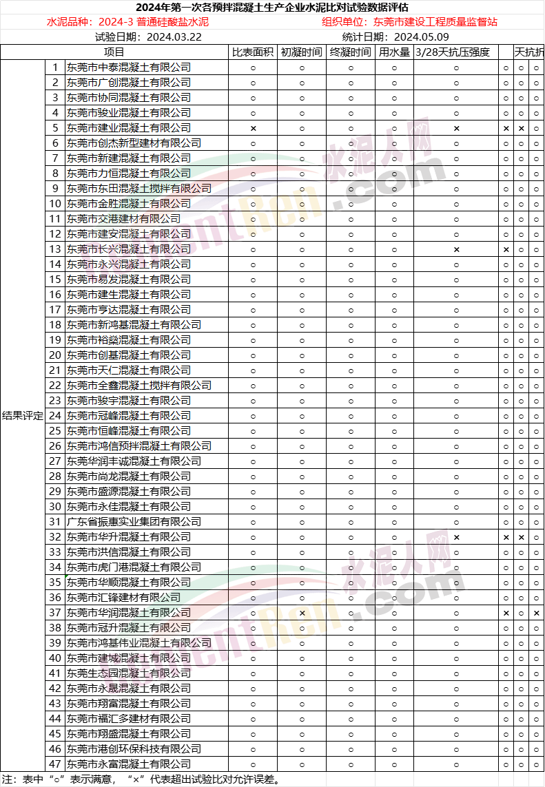 為加強(qiáng)對我市預(yù)拌混凝土生產(chǎn)企業(yè)的質(zhì)量管理,提高各企業(yè)試驗(yàn)室的檢測能力,我站于2024年3月22日組織各預(yù)拌混凝土生產(chǎn)企業(yè)進(jìn)行了2024年第一次水泥比對試驗(yàn),并于5月9日完成試驗(yàn)結(jié)果的統(tǒng)計工作?,F(xiàn)將有關(guān)情況通報如下: