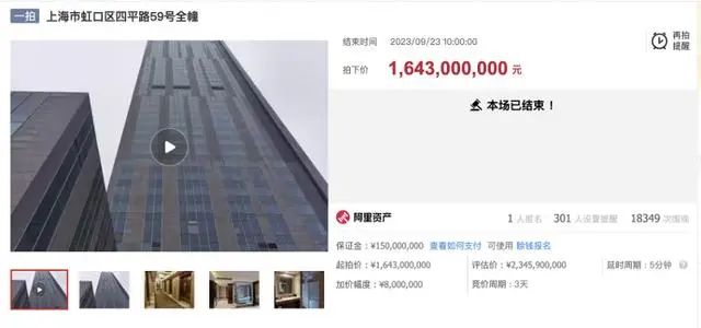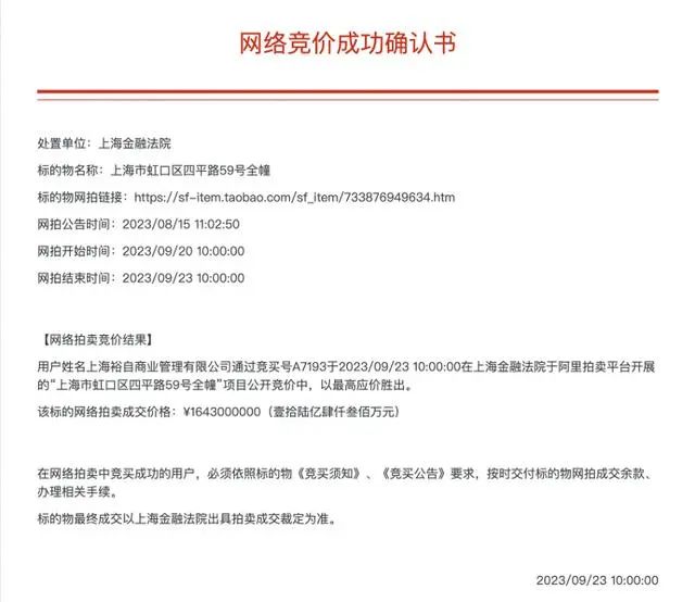 上海金融法院執(zhí)行立案后,于2023年9月23日公開拍賣被執(zhí)行人抵押的全幢酒店即涉案酒店。阿里資產(chǎn)拍賣平臺顯示,此次拍賣共有18349人圍觀,1人報名。最終酒店以16.43億元的成交價被上海裕自商業(yè)管理有限公司拍下。