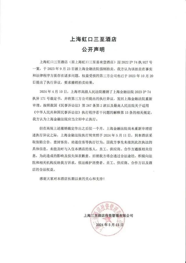 三至酒店微信公眾號顯示,2024年1月,公眾號名稱由“上海虹口三至喜來登酒店”認(rèn)證為“上海虹口三至酒店”。5月17日,三至酒店發(fā)布聲明稱,認(rèn)為拍賣在事實法律程序方面存在諸多問題,權(quán)益受損的第三方公司也提出了執(zhí)行異議,要求撤銷拍賣結(jié)果。