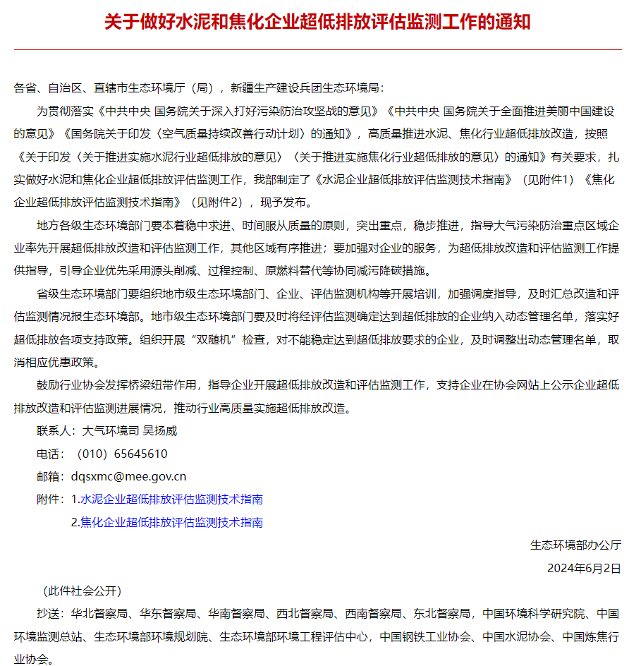 6月6日,生態(tài)環(huán)境部發(fā)布《關(guān)于做好水泥和焦化企業(yè)超低排放評估監(jiān)測工作的通知》(以下簡稱“通知”)要求地方各級生態(tài)環(huán)境部門要本著穩(wěn)中求進(jìn)、時間服從質(zhì)量的原則,突出重點(diǎn),穩(wěn)步推進(jìn),指導(dǎo)大氣污染防治重點(diǎn)區(qū)域企業(yè)率先開展超低排放改造和評估監(jiān)測工作,其他區(qū)域有序推進(jìn);要加強(qiáng)對企業(yè)的服務(wù),為超低排放改造和評估監(jiān)測工作提供指導(dǎo),引導(dǎo)企業(yè)優(yōu)先采用源頭削減、過程控制、原燃料替代等協(xié)同減污降碳措施。