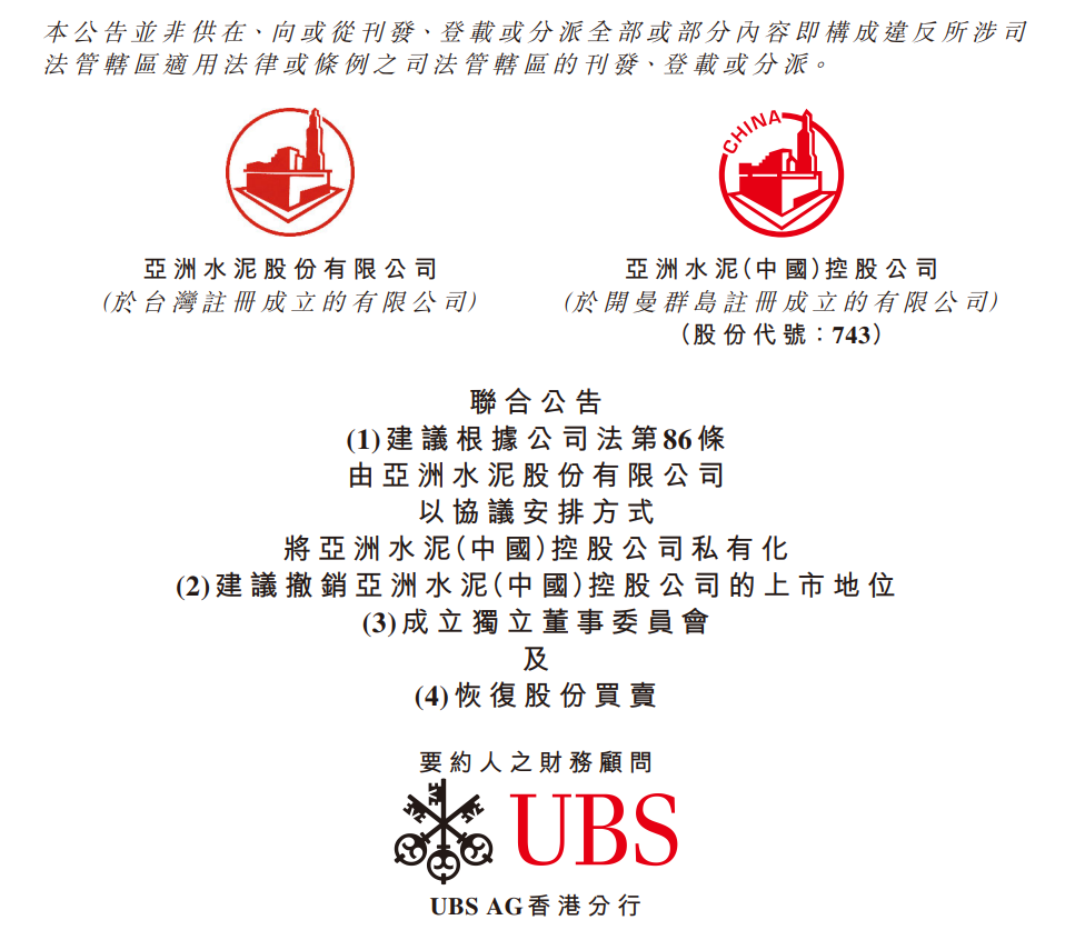 日前,亞洲水泥(中國)(00743.HK)公告,要約人(亞洲水泥股份有限公司,其股份于臺灣證交所上市,并且為公司控股股東)與公司的相關董事聯(lián)合宣布,于2024年6月5日,要約人就該建議根據(jù)公司法第86條以協(xié)議安排方式將公司私有化,請求董事會向計劃股東提呈該建議,其中涉及注銷計劃股份,并且作為注銷該等股份的代價,就每股計劃股份以現(xiàn)金向計劃股東支付要約價,以及撤銷股份于香港聯(lián)交所的上市地位。