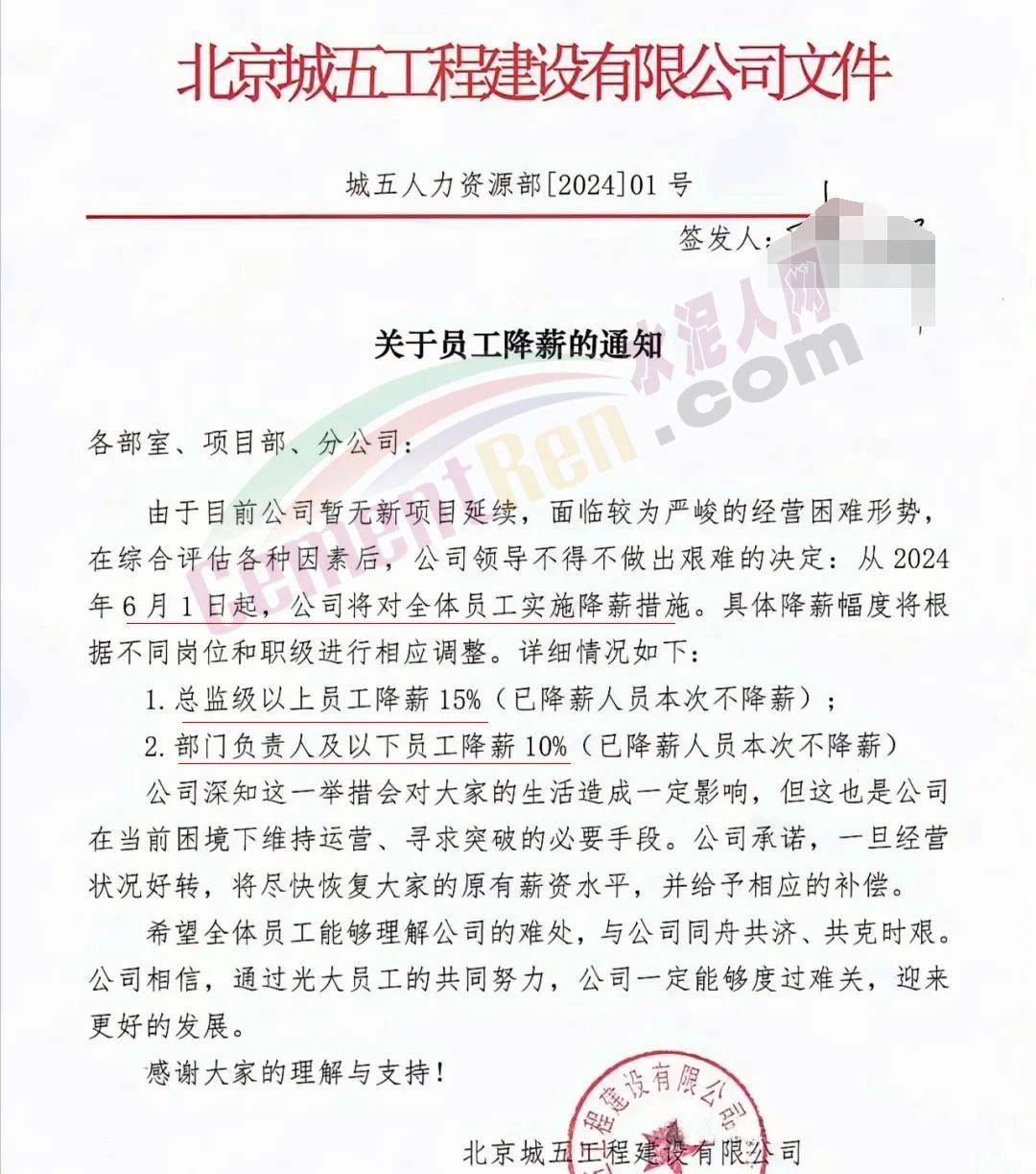 北京一家大型建筑企業(yè)公開(kāi)發(fā)布通知稱,從2024年6月1日起,公司將對(duì)全體員工實(shí)施降薪措施。其中總監(jiān)級(jí)以上員工降薪15%,部門負(fù)責(zé)人及以下員工降薪10%。