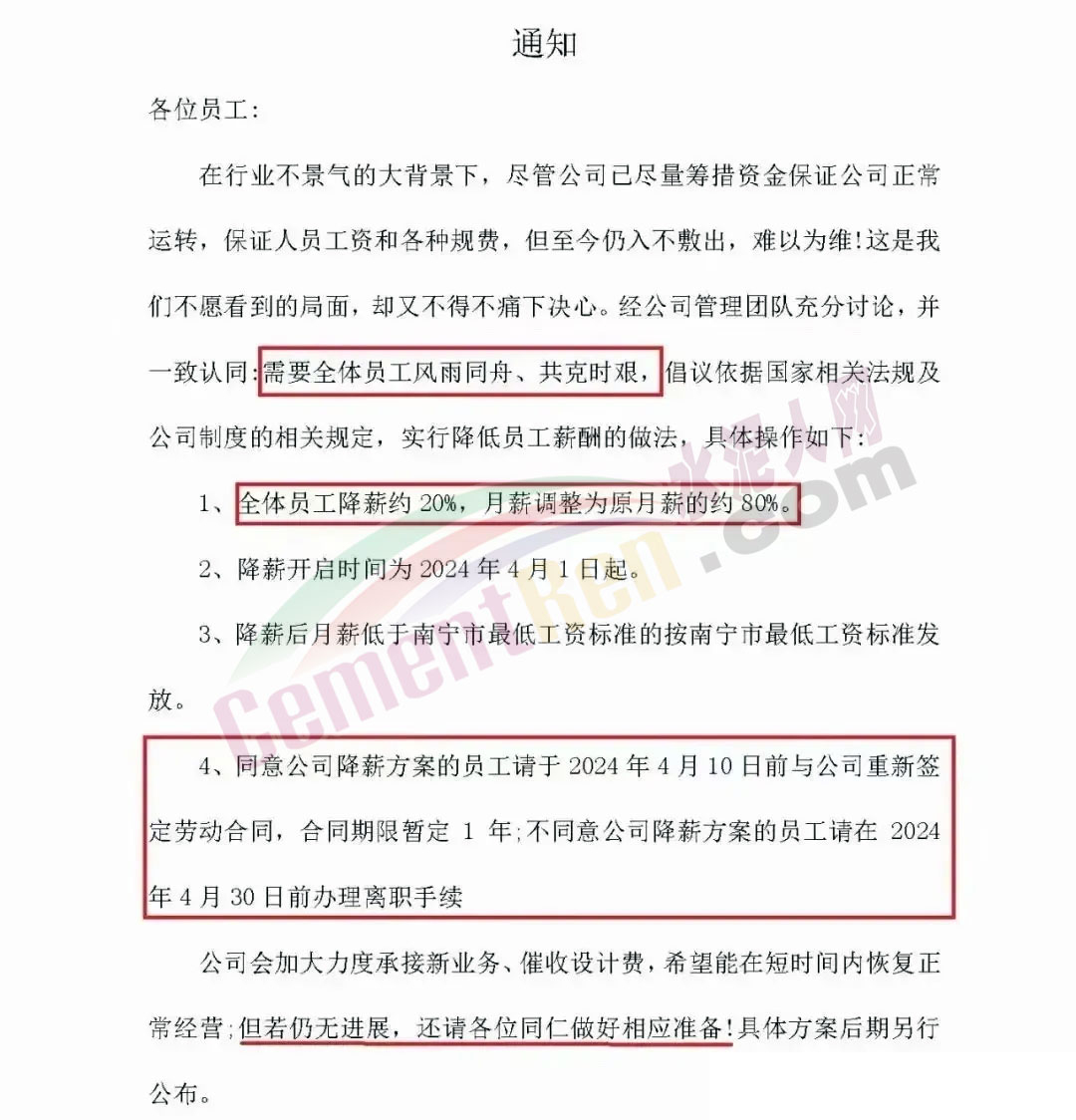 某施工企業(yè)通知稱,鑒于目前建筑市場(chǎng)低迷,公司自2023年至今未能接到任何新項(xiàng)目。考慮到未來(lái)短時(shí)間內(nèi),建筑行業(yè)很難有較大起色,公司決定2024年2月起將對(duì)所有員工開(kāi)始降薪30%~50%。