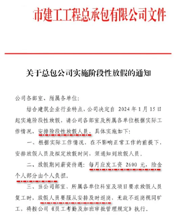某建工工程總承包公司通知稱,2024年1月15日公司開(kāi)始陸續(xù)放假,一直到2024年12月31日。從2月1日到12月31日開(kāi)始放假,待崗人員每月發(fā)放2600元基本工資,社保個(gè)人部分自己負(fù)擔(dān)。