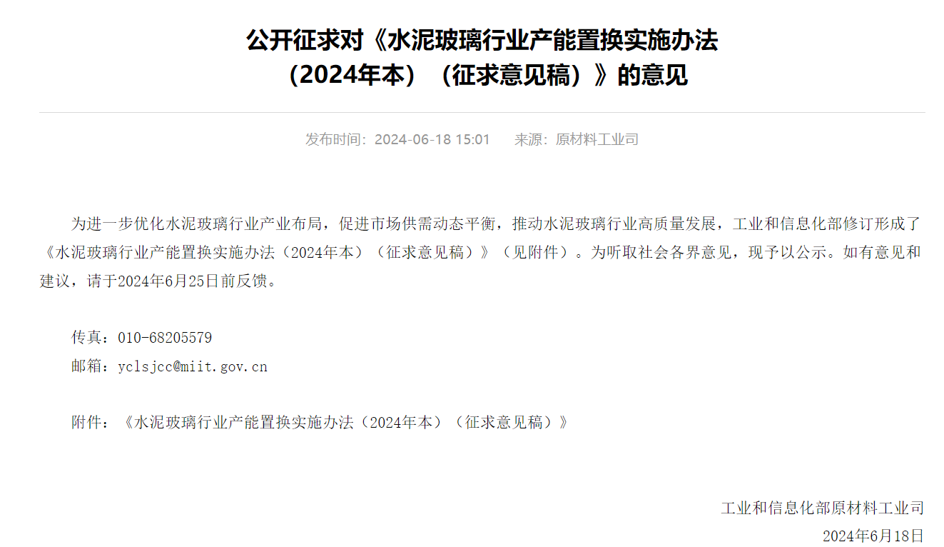 6月18日,工信部發(fā)布《水泥玻璃行業(yè)產(chǎn)能置換實(shí)施辦法(2024年本)(征求意見稿)》公開征求意見。