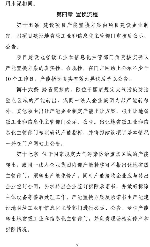 用于置換的水泥熟料生產(chǎn)線產(chǎn)能不能拆分轉(zhuǎn)讓。位于國家規(guī)定的大氣污染防治重點(diǎn)區(qū)域或水泥熟料產(chǎn)能利用率低于50%省區(qū)的新建水泥熟料生產(chǎn)線,原則上不得從省外置換產(chǎn)能。另外還提及水泥熟料產(chǎn)能置換比例要求。
