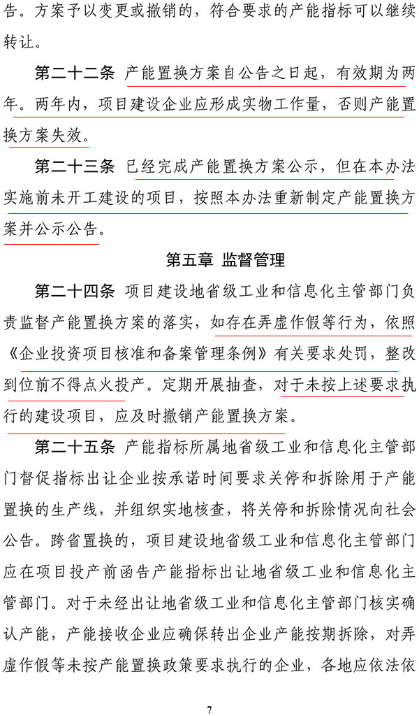 項(xiàng)目建設(shè)地省級工業(yè)和信息化主管部門負(fù)責(zé)監(jiān)督產(chǎn)能置換方案的落實(shí),如存在弄虛作假等行為,依照《企業(yè)投資項(xiàng)目核準(zhǔn)和備案管理?xiàng)l例》有關(guān)要求處罰,整改到位前不得點(diǎn)火投產(chǎn)。定期開展抽查,對于未按上述要求執(zhí)行的建設(shè)項(xiàng)目,應(yīng)及時(shí)撤銷產(chǎn)能置換方案。