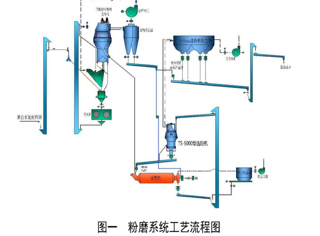 隨著節(jié)能減碳與水泥新標(biāo)準(zhǔn)實(shí)施的臨近,市場(chǎng)對(duì)水泥裝備及水泥產(chǎn)品提出了更高的要求,選粉機(jī)作為節(jié)能減碳的重要裝備以及決定產(chǎn)品質(zhì)量的最終裝備,顯得尤為重要。為了適應(yīng)新的要求,蘇州天山水泥有限公司會(huì)同江蘇吉能達(dá)公司運(yùn)用多級(jí)氣流分散分級(jí)理論,對(duì)水泥粉磨系統(tǒng)(工藝流程見(jiàn)圖一)磨尾使用的TS-5000型選粉機(jī)進(jìn)行了設(shè)計(jì)改進(jìn),分別于2021年和2024年初結(jié)合大修做了實(shí)施。新設(shè)計(jì)改進(jìn)的選粉機(jī)選粉效率提高了10%;系統(tǒng)產(chǎn)量提高了15噸/時(shí);水泥產(chǎn)品粒度分布更符合市場(chǎng)及水泥新標(biāo)準(zhǔn)的要求。