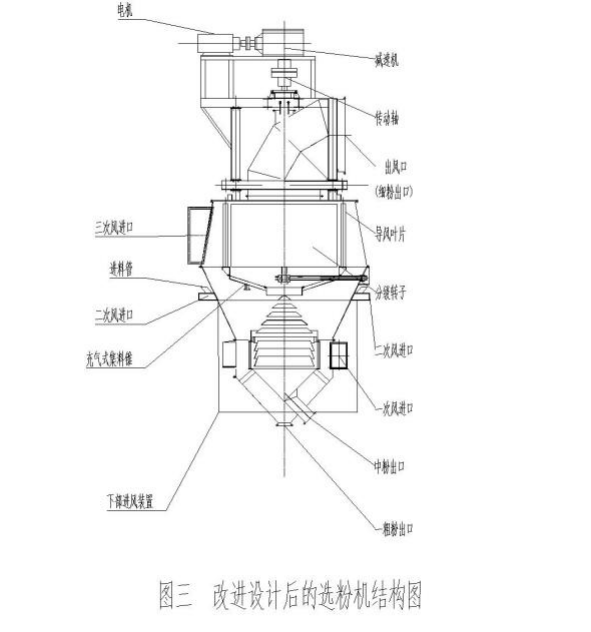 (1)改進(jìn)后選粉機(jī)的的結(jié)構(gòu)(如圖三所示),對(duì)比圖二、圖三可以看出,選粉機(jī)結(jié)構(gòu)做了三個(gè)改進(jìn):