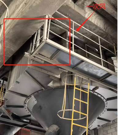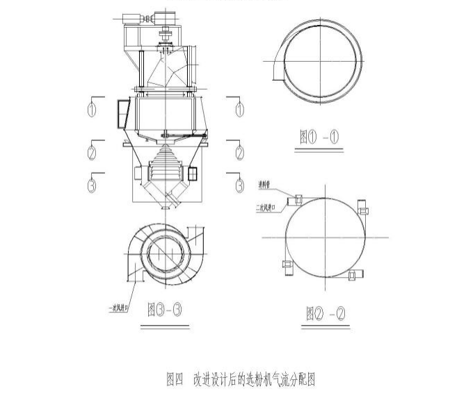B、改設(shè)氣流分配通道。原設(shè)計(jì)選粉機(jī)有一次風(fēng)進(jìn)口、二次風(fēng)進(jìn)口,改進(jìn)后選粉機(jī)三個(gè)進(jìn)風(fēng)口。一次風(fēng)進(jìn)口(見(jiàn)圖四中圖①-①)風(fēng)源來(lái)自環(huán)境風(fēng),用于的選粉機(jī)粗粉回料的二次清洗;二次風(fēng)進(jìn)口(見(jiàn)圖四中圖②-②)風(fēng)源也來(lái)自環(huán)境風(fēng),其作用是分散喂入選粉機(jī)的物料;三次風(fēng)進(jìn)口(見(jiàn)圖四中圖③-③)用于處理原一次風(fēng)進(jìn)口的磨前輥壓機(jī)系統(tǒng)的外排放風(fēng)。