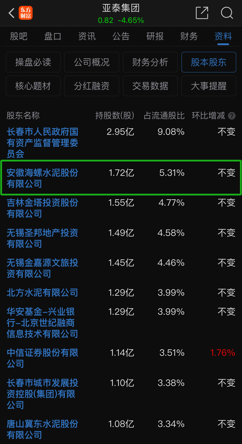 截至6月25日,亞泰集團(tuán)已經(jīng)連續(xù)4個交易日股票收盤價低于1元,亞泰集團(tuán)的股價持續(xù)下滑牽動著海螺水泥的神經(jīng)。據(jù)公開消息顯示,海螺水泥是亞泰集團(tuán)的第二大股東,持股比例為5.31%,總持股數(shù)為1.72億股。