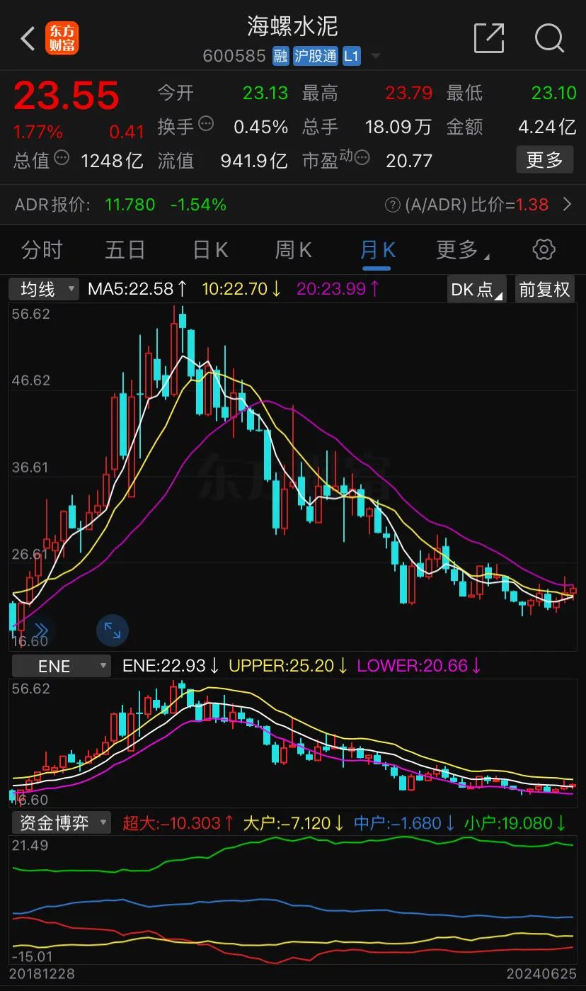 截至2024年6月25日,海螺水泥的股票最低價為23.1元/股,市值為1244億元“,而較2020年7月31日的歷史最高值56.62元/股,總市值3000.29億元,股價下跌59%,總市值蒸發(fā)1756.29億元。
