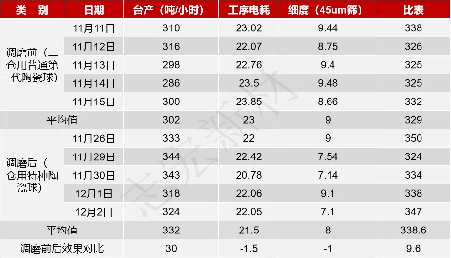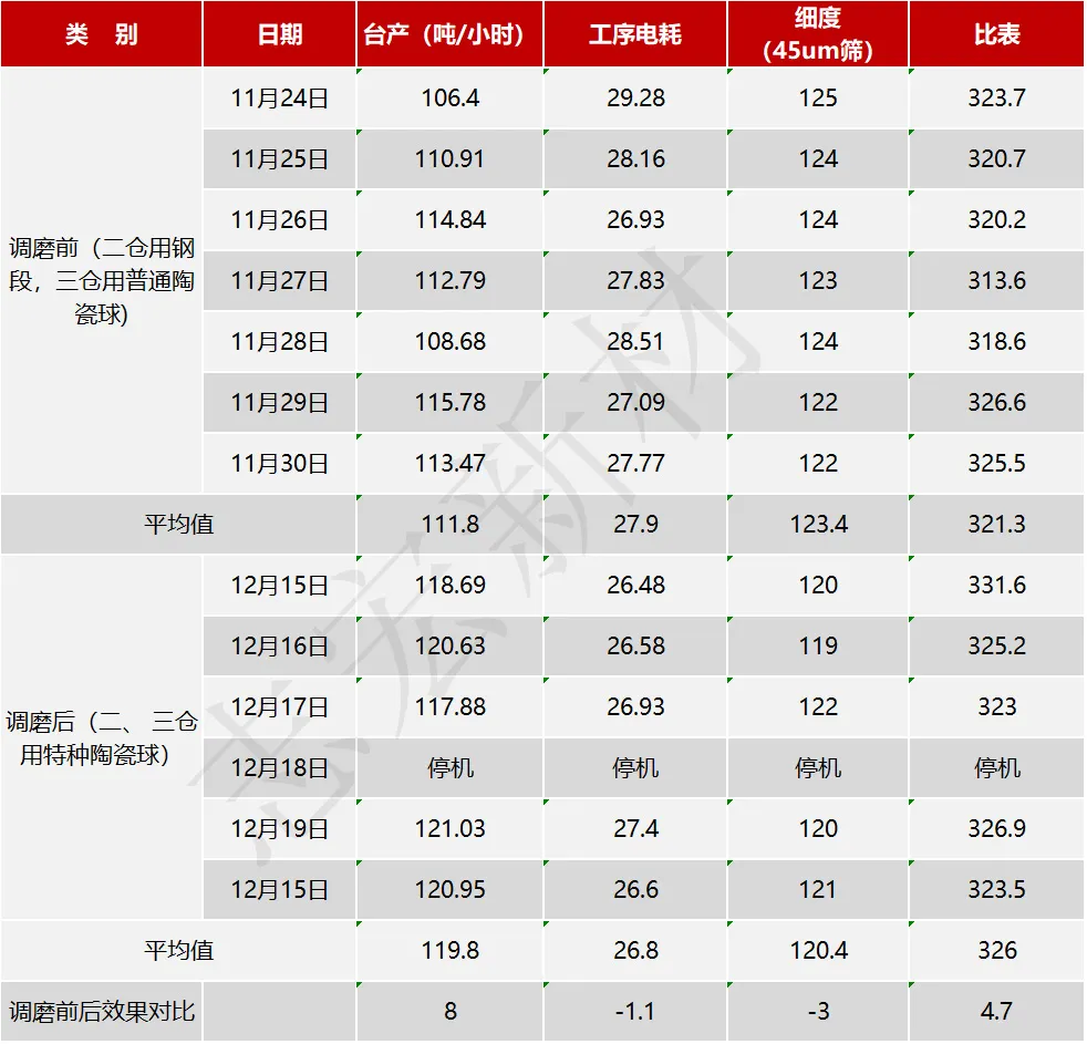 貴州某水泥企業(yè)水泥磨粉磨工序調(diào)磨前后統(tǒng)計數(shù)據(jù)及對比