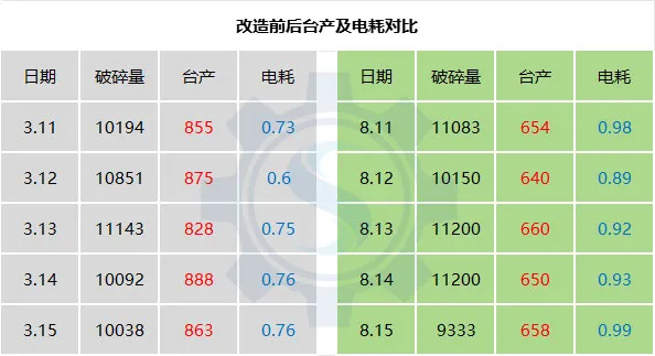 破碎機(jī)錘頭也由原來的50個減少至16個,大大降低了錘頭損耗量;轉(zhuǎn)子工作直徑從2米增大到2.2米,打擊面也擴(kuò)大了;改造前破碎機(jī)只有下方出料,現(xiàn)在是前后都出料,增加了物料通過能力。經(jīng)過技術(shù)改造后,不僅提高了臺產(chǎn),在增大電機(jī)的情況下依然降低了電耗,而且實現(xiàn)了水泥骨料共產(chǎn)。