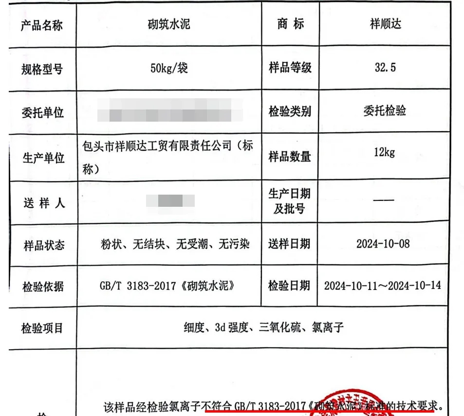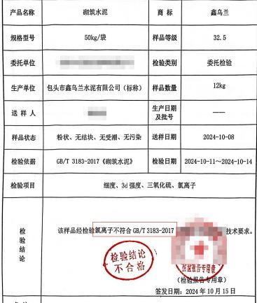 標(biāo)稱為包頭市鑫烏蘭水泥有限公司生產(chǎn)的一批次“鑫烏蘭”牌,砌筑M32.5水泥氯離子含量0.18%,較標(biāo)準(zhǔn)要求高出3倍,不符合標(biāo)準(zhǔn)要求,檢驗結(jié)論為不合格。