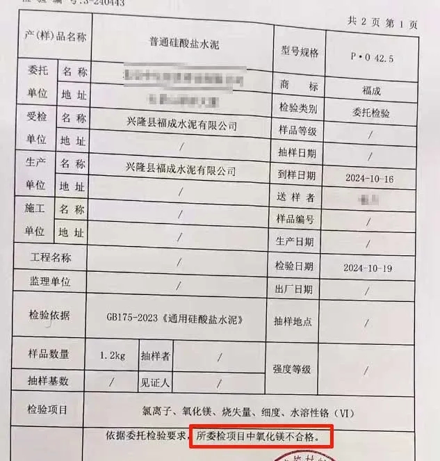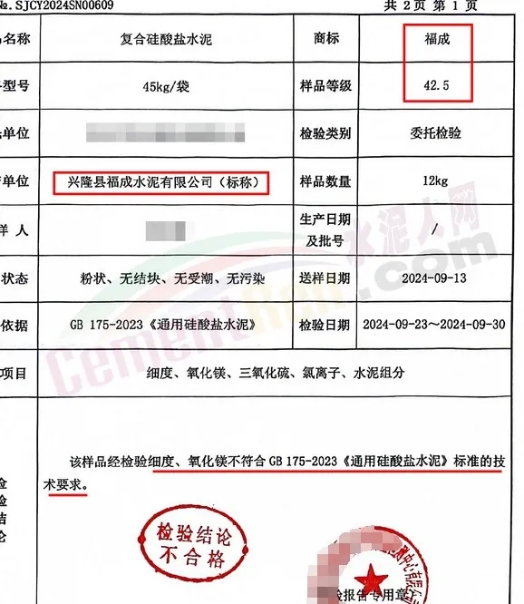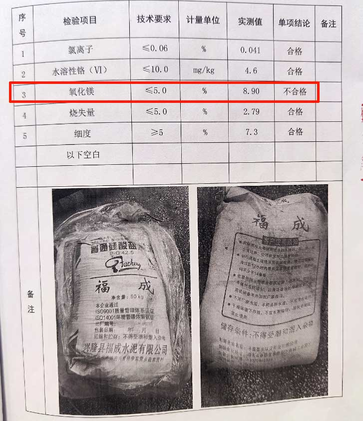 標(biāo)稱生產(chǎn)企業(yè)為興隆縣福成水泥有限公司生產(chǎn)的一批次福成牌P.O42.5水泥,氧化鎂項目不合格。