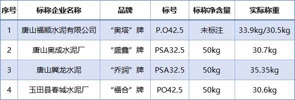 凈含量與標(biāo)準(zhǔn)要求不符的水泥產(chǎn)品4個批次