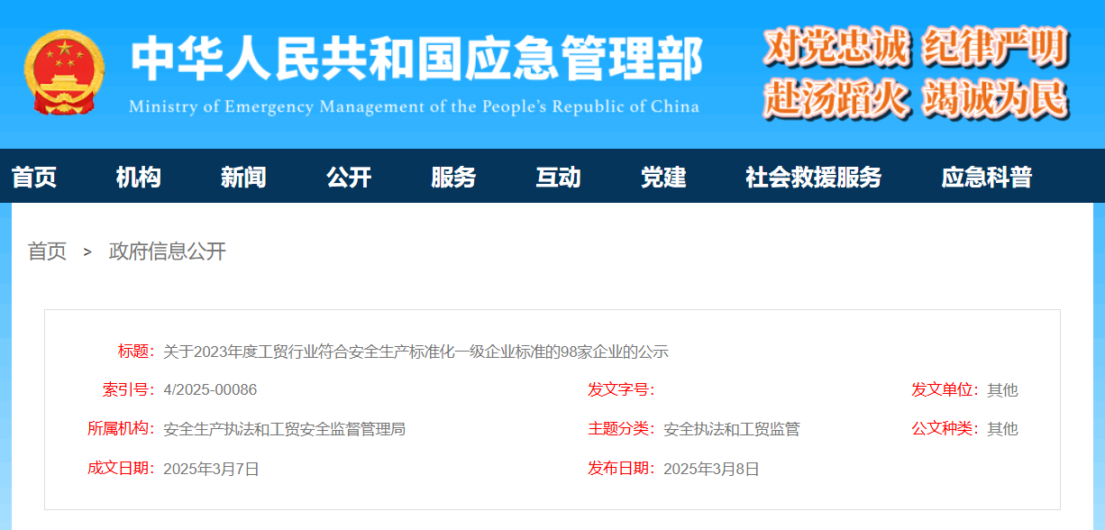 日前,應(yīng)急管理部發(fā)布關(guān)于2023年度工貿(mào)行業(yè)符合安全生產(chǎn)標(biāo)準(zhǔn)化一級(jí)企業(yè)標(biāo)準(zhǔn)的98家企業(yè)的公示稱,按照《應(yīng)急管理部關(guān)于印發(fā)企業(yè)安全生產(chǎn)標(biāo)準(zhǔn)化建設(shè)定級(jí)辦法的通知》(應(yīng)急〔2021〕83號(hào),以下簡稱《定級(jí)辦法》)要求,經(jīng)企業(yè)自評(píng)、申請(qǐng)、評(píng)審等程序,大冶特殊鋼有限公司煉鐵廠等98家企業(yè)符合安全生產(chǎn)標(biāo)準(zhǔn)化一級(jí)企業(yè)標(biāo)準(zhǔn),現(xiàn)予以公示。公示時(shí)間為2025年3月7日至14日。