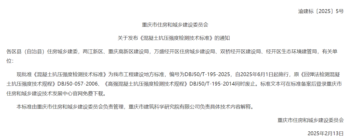 日前,重慶市住房和城鄉(xiāng)建設(shè)委員會(huì)關(guān)于發(fā)布《混凝土抗壓強(qiáng)度檢測(cè)技術(shù)標(biāo)準(zhǔn)》的通知稱,已批準(zhǔn)《混凝土抗壓強(qiáng)度檢測(cè)技術(shù)標(biāo)準(zhǔn)》為重慶市工程建設(shè)地方標(biāo)準(zhǔn),編號(hào)為DBJ50/T-195-2025,自2025年6月1日起施行,原《回彈法檢測(cè)混凝土抗壓強(qiáng)度技術(shù)規(guī)程》DBJ50-057-2006、《高強(qiáng)混凝土抗壓強(qiáng)度檢測(cè)技術(shù)規(guī)程》DBJ50/T-195-2014同時(shí)廢止。標(biāo)準(zhǔn)文本可在標(biāo)準(zhǔn)備案后登錄重慶市住房和城鄉(xiāng)建設(shè)技術(shù)發(fā)展中心官網(wǎng)免費(fèi)下載。本標(biāo)準(zhǔn)由重慶市住房和城鄉(xiāng)建設(shè)委員會(huì)負(fù)責(zé)管理,重慶市建筑科學(xué)研究院有限公司負(fù)責(zé)具體技術(shù)內(nèi)容解釋。